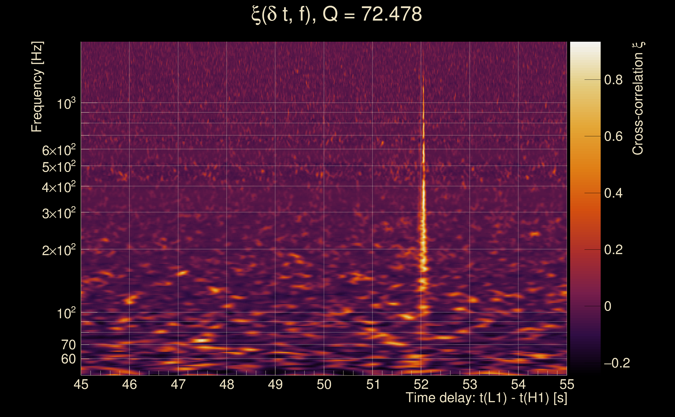 | Time delay between detectors t(L1) - t(H1): | 17.1679 s (slice index = 176 / 225), δt_gw = 0.0116198 s |