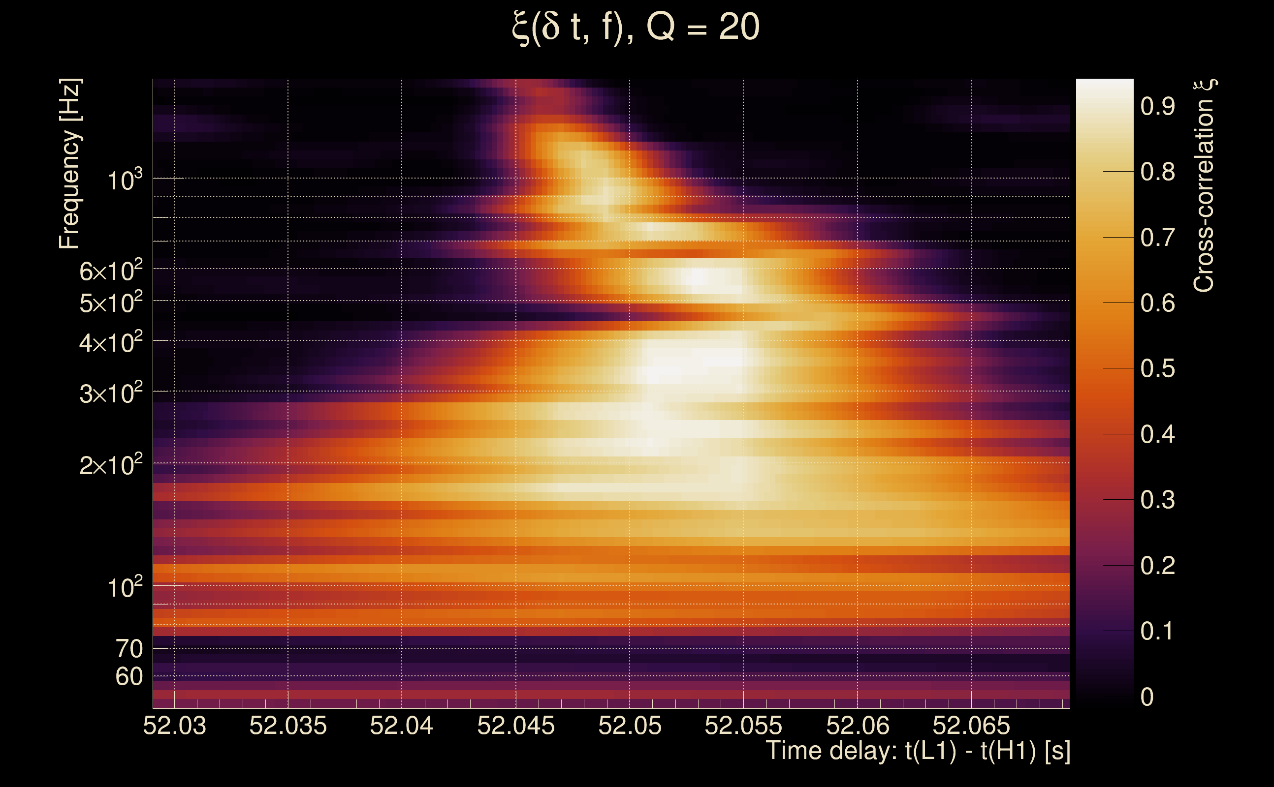 | Time delay between detectors t(L1) - t(H1): | 42.2685 s (slice index = 61 / 225), δt_gw = 0.00241027 s |