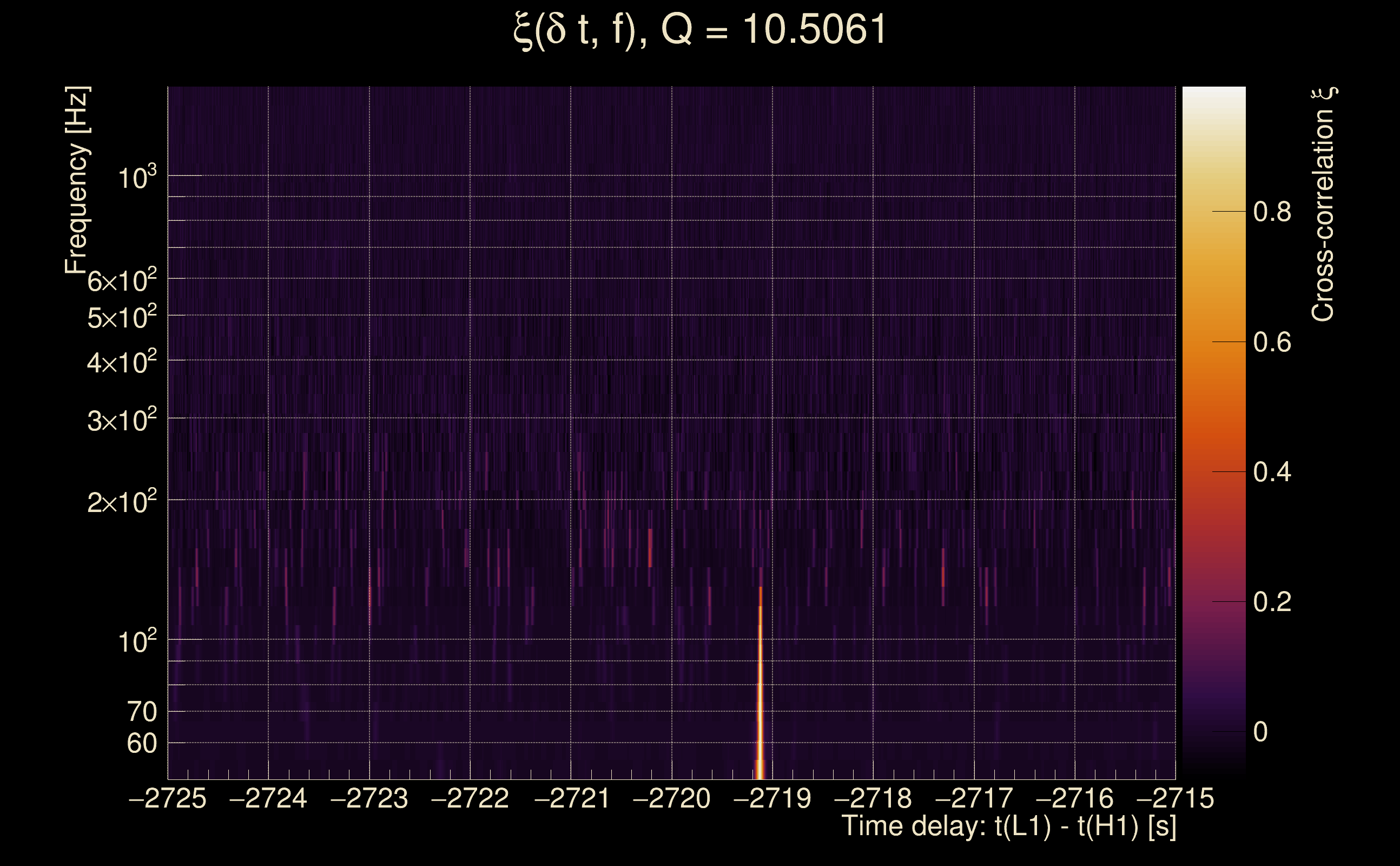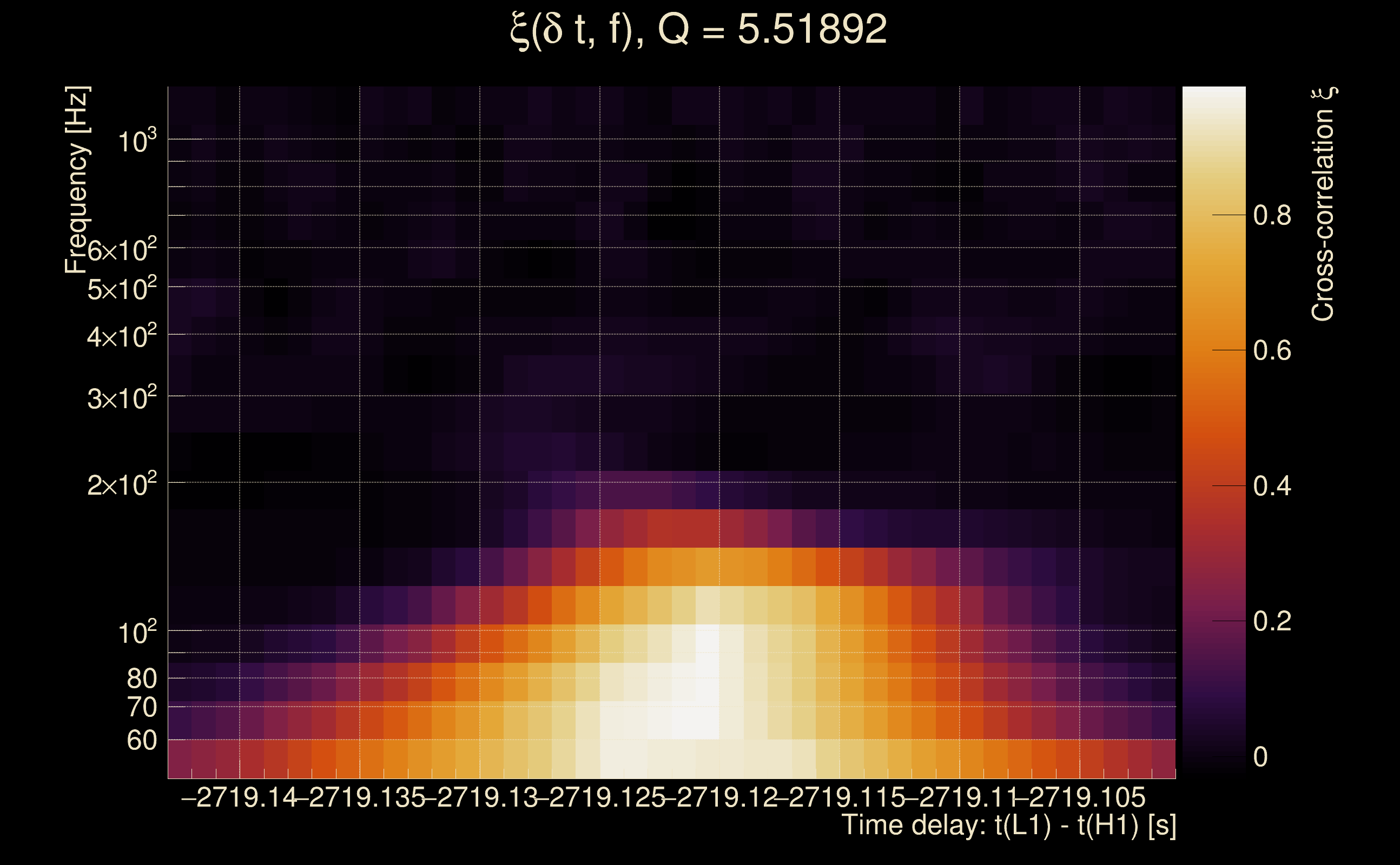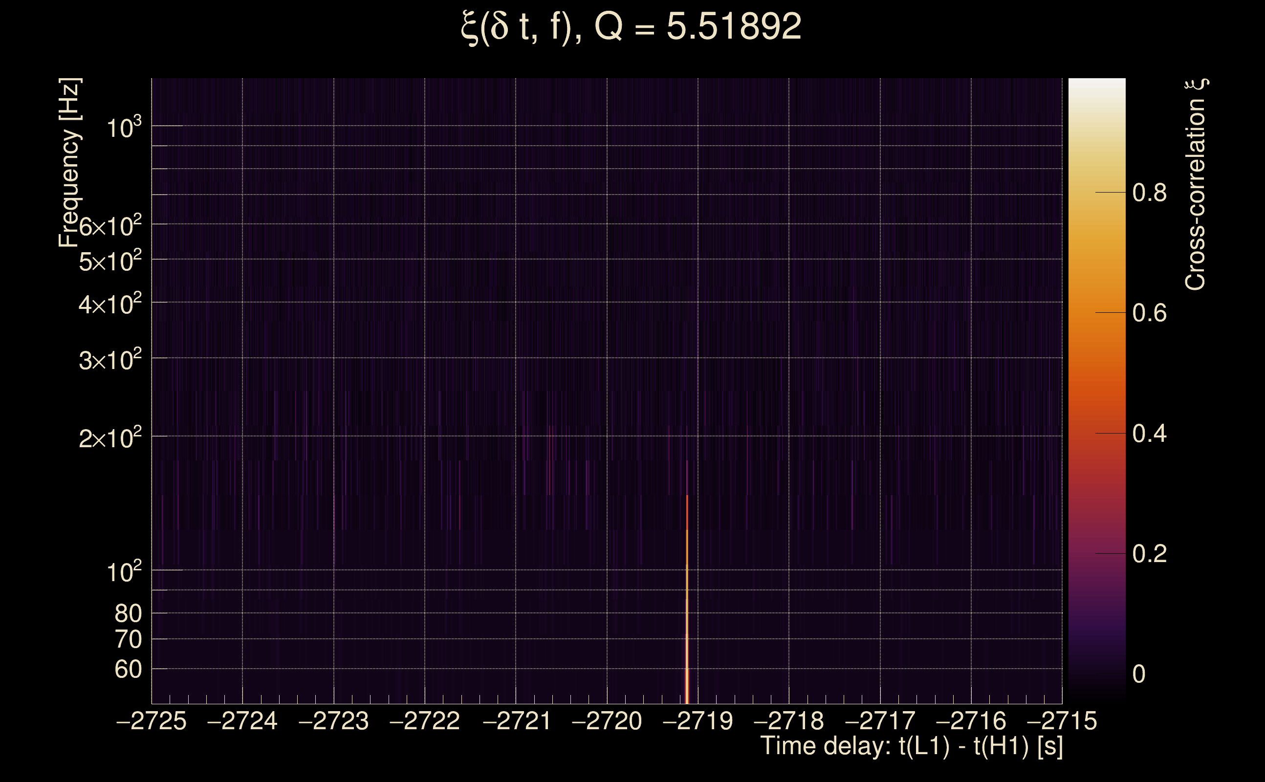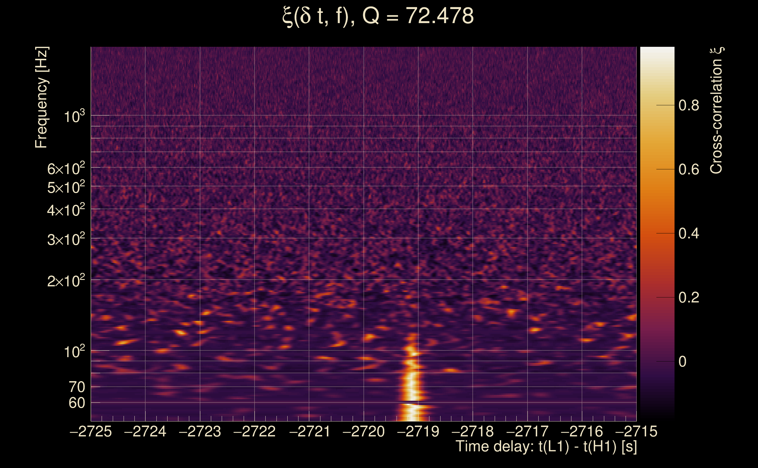 | Time delay between detectors t(L1) - t(H1): | -2729.12 s (slice index = 89 / 217), δt_gw = 0.00153224 s |