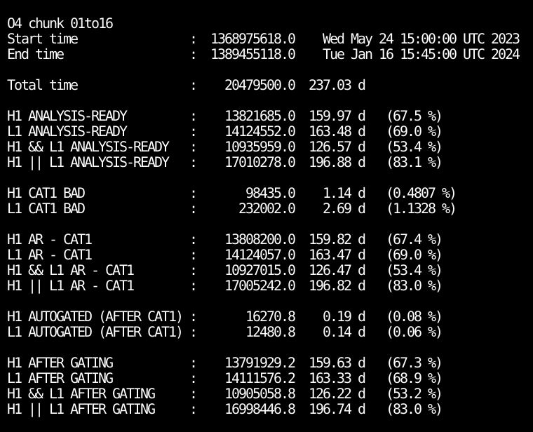3) The good DQ segments and effective analysis times are given chunk by chunk in the links of the above table. They can also be found here for the whole O4a period, with the following summary numbers.