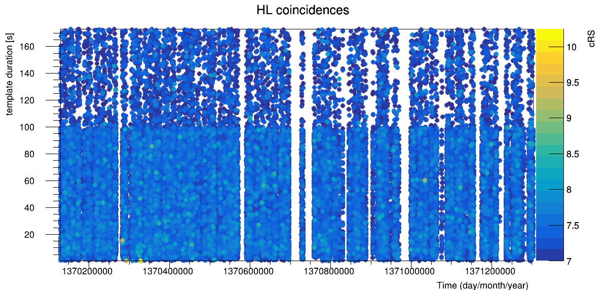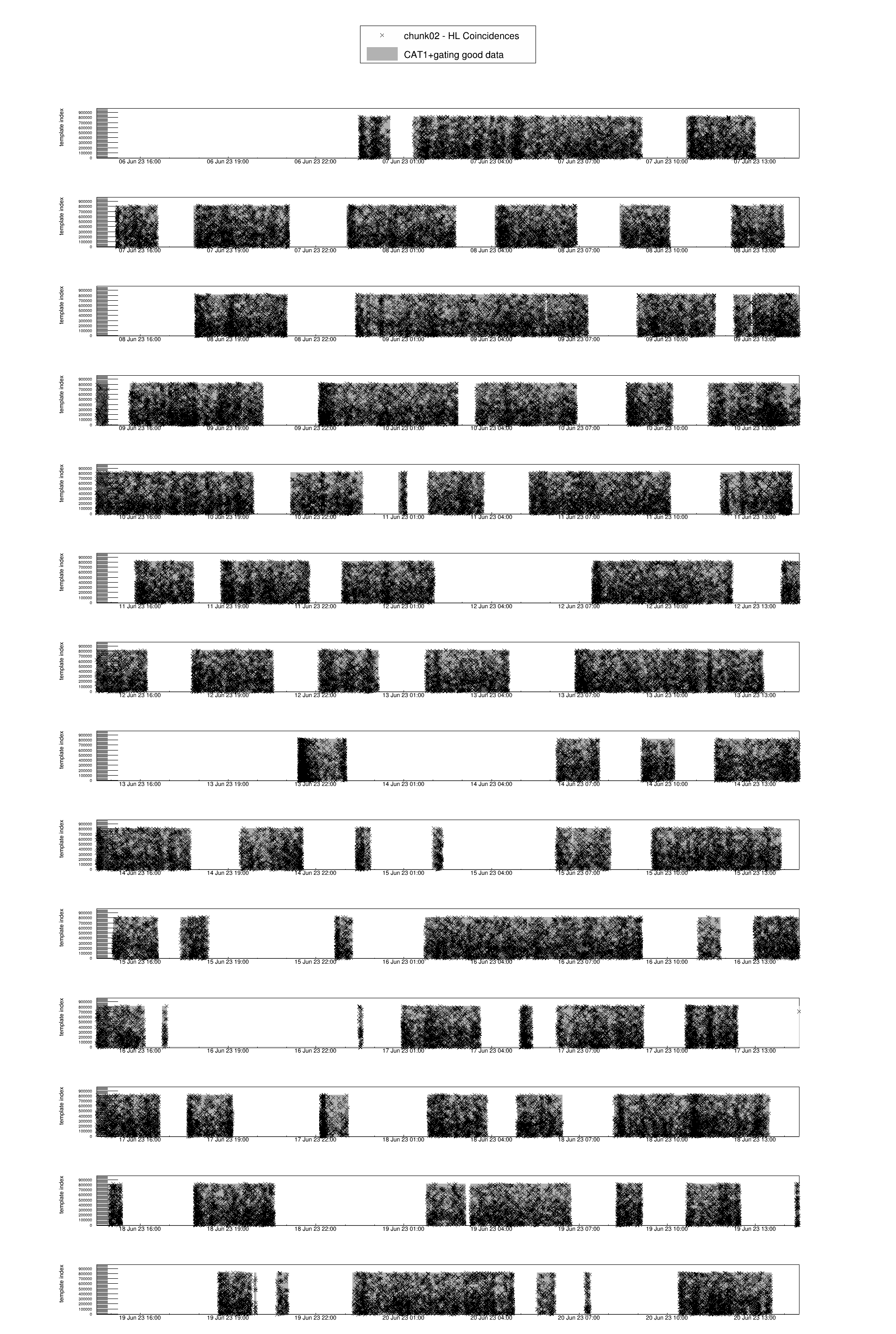 Fig Mon.4 : The grey band shows the periods in which the data is considered good (ANALYSIS-READY segments after CAT1 vetoes and gating). Black crosses show the template index for HL coincidences, with a combined ranking statistic of at least 7.
