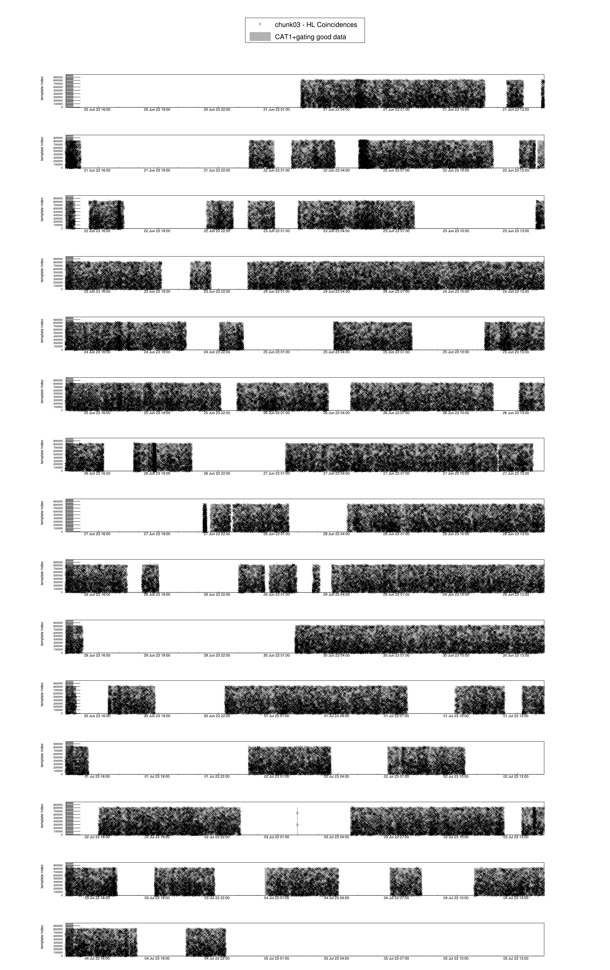 Fig Mon.4 : The grey band shows the periods in which the data is considered good (ANALYSIS-READY segments after CAT1 vetoes and gating). Black crosses show the template index for HL coincidences, with a combined ranking statistic of at least 7.