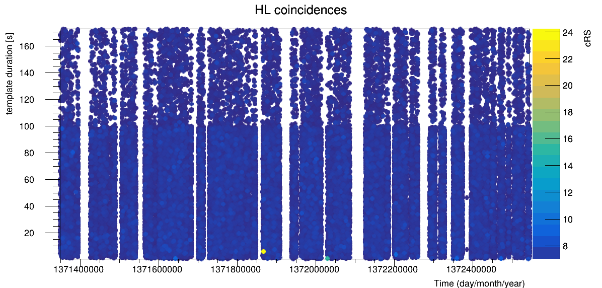 Fig Mon.5 : Combined ranking statistics (reweighted SNR times SNR excess) of HL coincidences as a function of the template duration and of the coincidence time.