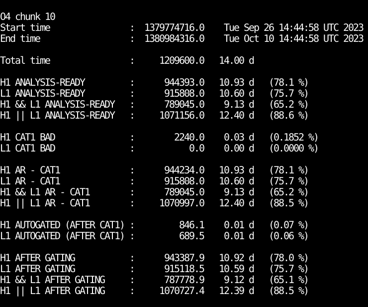 The list of actually analysed segments (analysis ready segments considered good after removal of CAT1 vetoes and after MBTA gating) can be found here for H1 and L1 and the table below summarises the corresponding times.| after CAT1 (in days) | after Gating (in days) | |