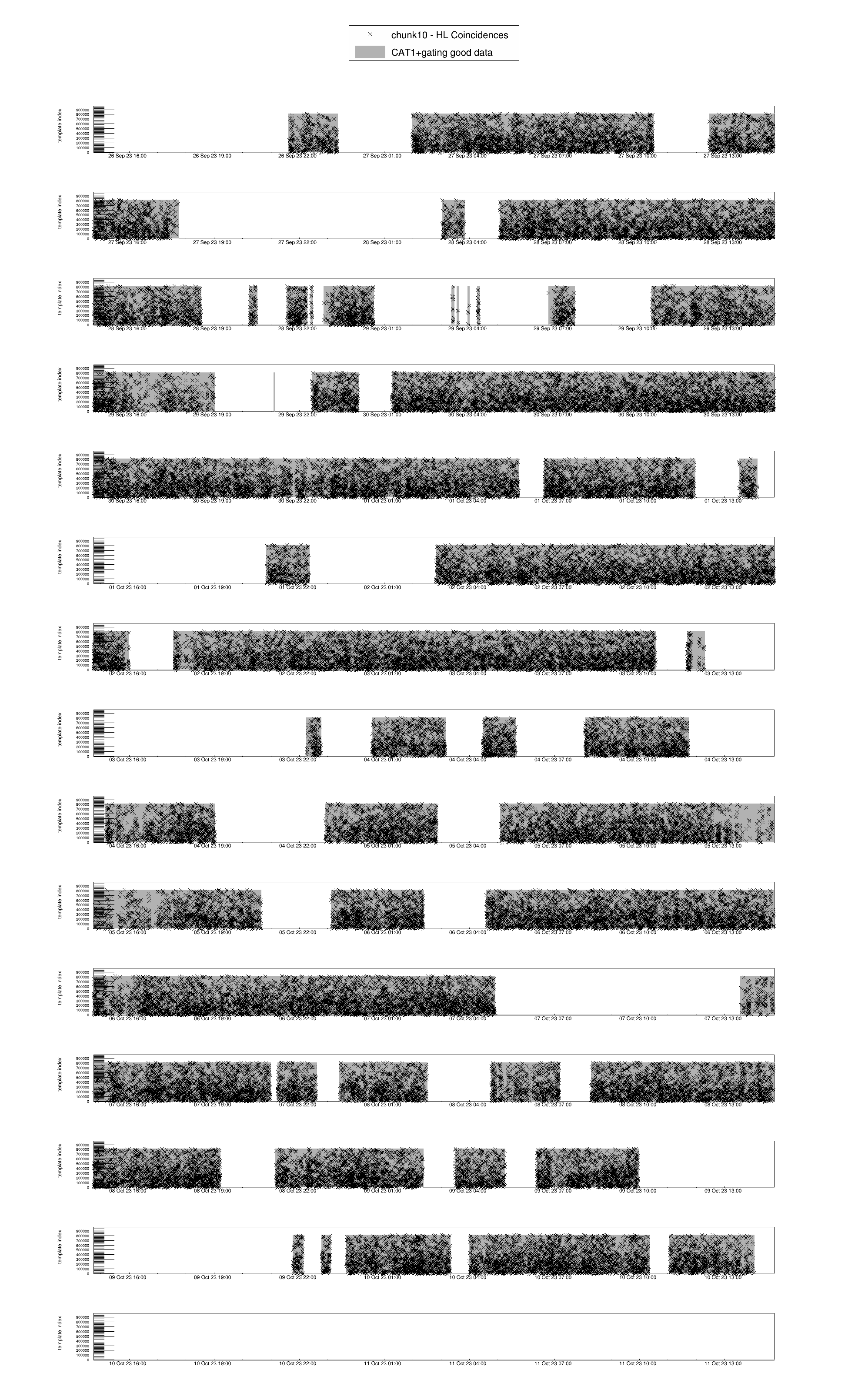 Fig Mon.4 : The grey band shows the periods in which the data is considered good (ANALYSIS-READY segments after CAT1 vetoes and gating). Black crosses show the template index for HL coincidences, with a combined ranking statistic of at least 7.