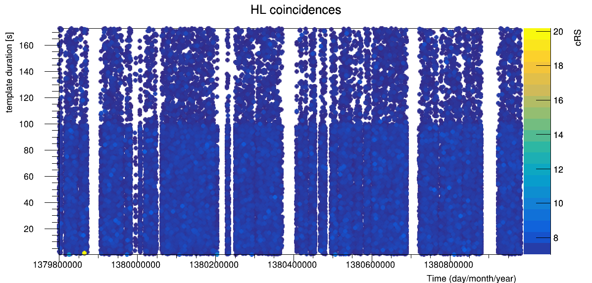 Fig Mon.5 : Combined ranking statistics (reweighted SNR times SNR excess) of HL coincidences as a function of the template duration and of the coincidence time.