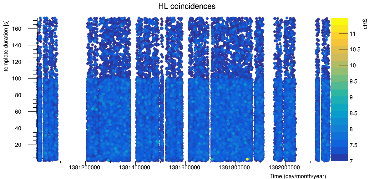 Fig Mon.5 : Combined ranking statistics (reweighted SNR times SNR excess) of HL coincidences as a function of the template duration and of the coincidence time.