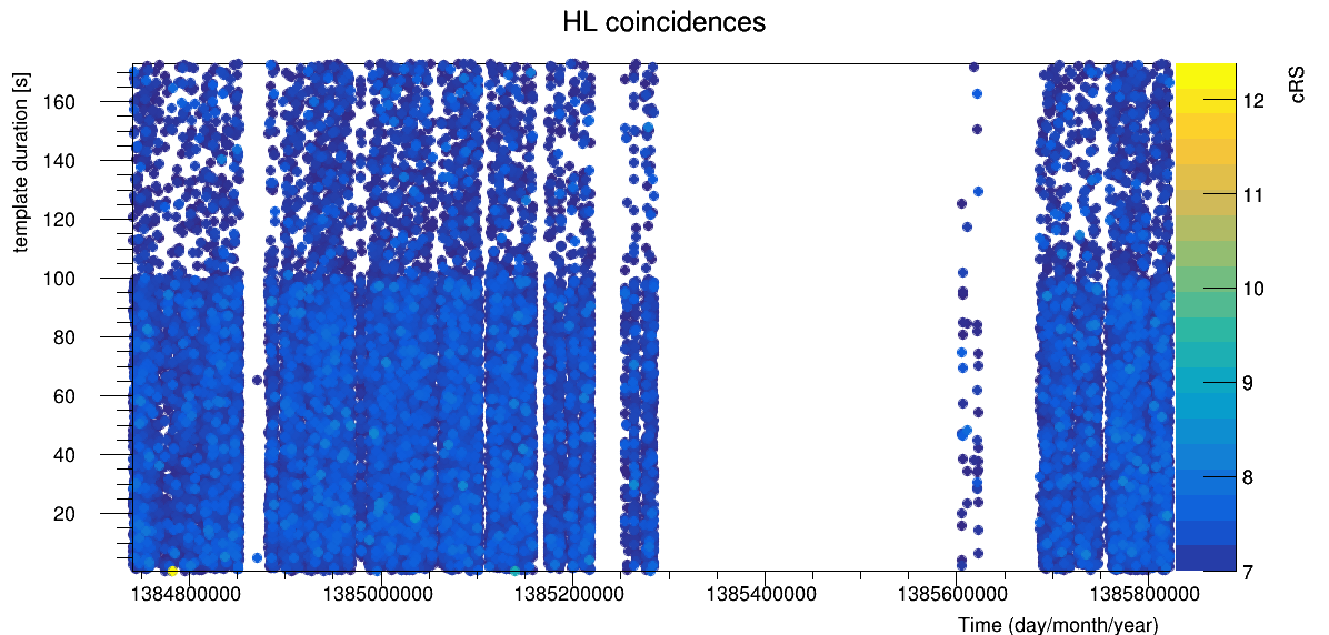 Fig Mon.4 : The grey band shows the periods in which the data is considered good (ANALYSIS-READY segments after CAT1 vetoes and gating). Black crosses show the template index for HL coincidences, with a combined ranking statistic of at least 7.