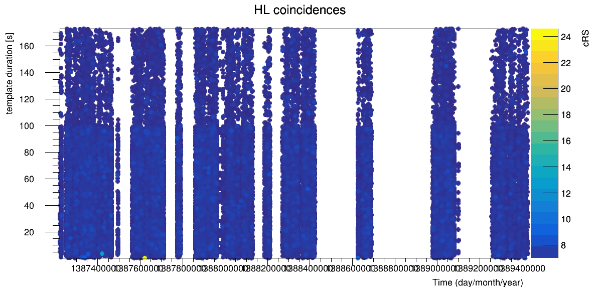 Fig Mon.5 : Combined ranking statistics (reweighted SNR times SNR excess) of HL coincidences as a function of the template duration and of the coincidence time.