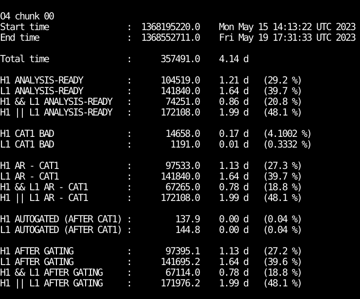 The list of actually analysed segments (analysis ready segments considered good after removal of CAT1 vetoes and after MBTA gating) can be found here for H1 and L1 and the table below summarises the corresponding times.| after CAT1 (in days) | after Gating (in days) | |