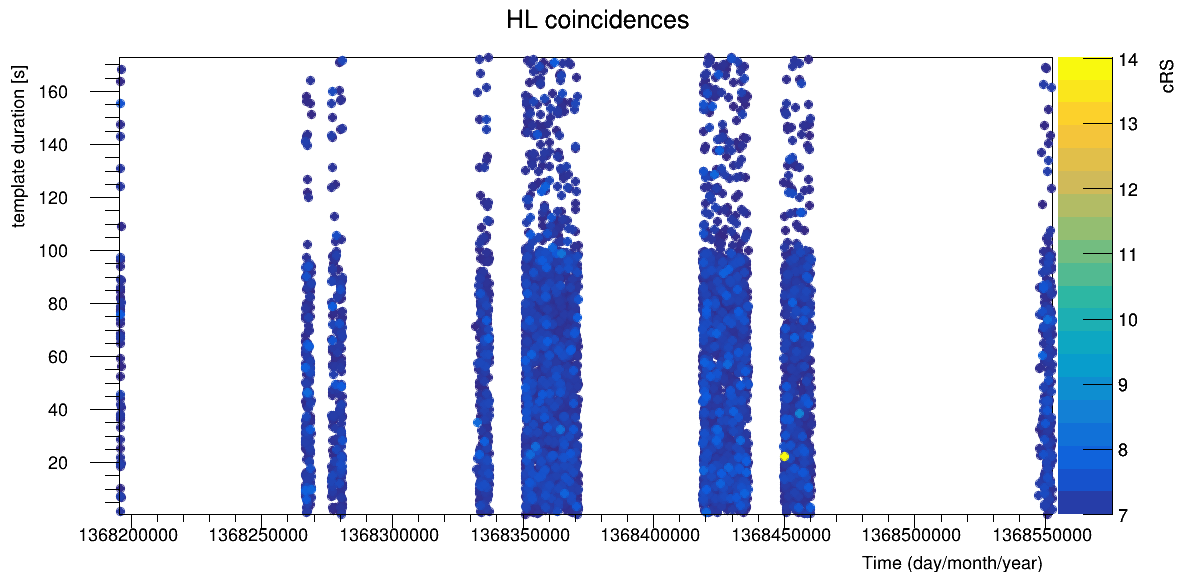 Fig Mon.5 : Combined ranking statistics (reweighted SNR times SNR excess) of HL coincidences as a function of the template duration and of the coincidence time.
