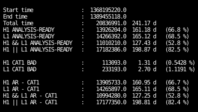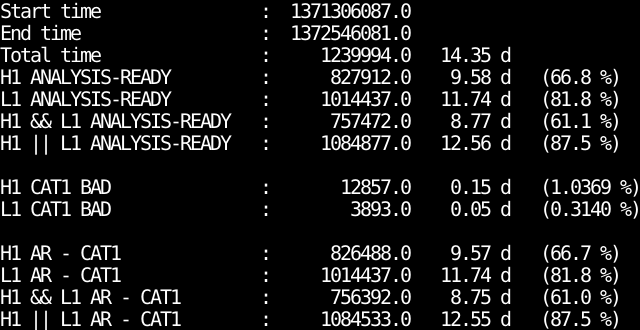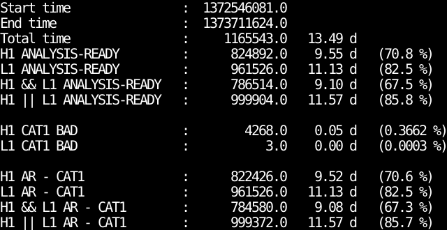 - IFO_ANALYSIS_READY-CAT1.txt : Analysis ready segments minus bad CAT1 segments
