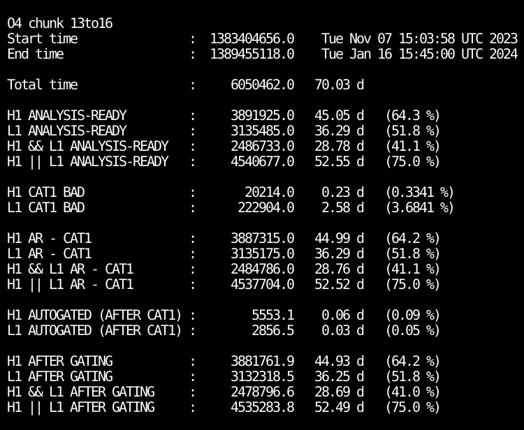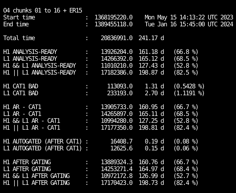 3) The good DQ segments and effective analysis times are given chunk by chunk in the links of the above table. They can also be found here for the whole O4a period, with the following summary numbers.